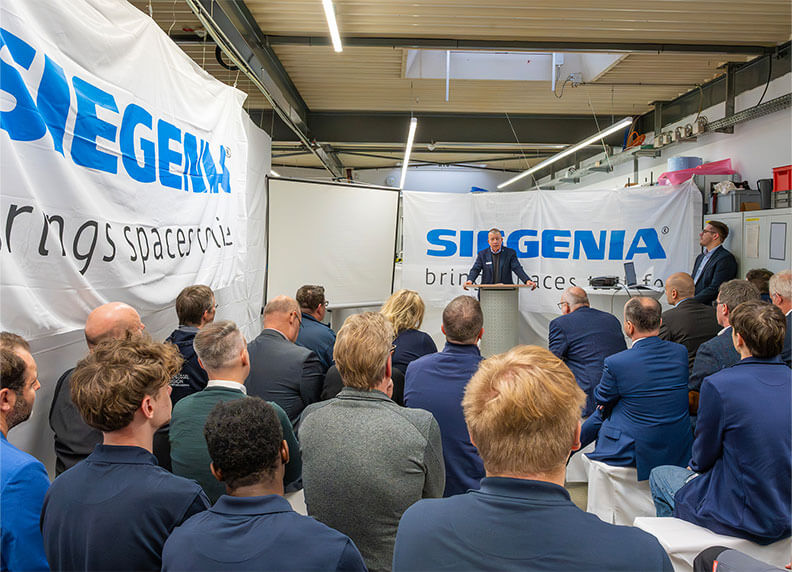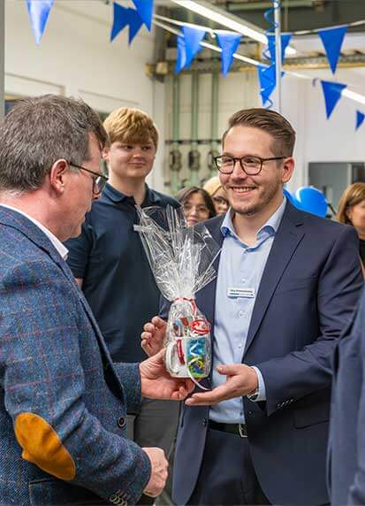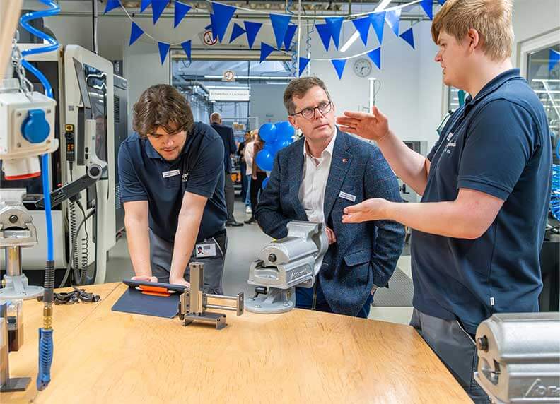 Nach einem herzlichen Willkommen stellte Nico Kimmeskamp, Ausbilder und Initiator des Projekts, zunächst Konzept und Hintergründe des neuen Ausbildungszentrums vor. Wieland Frank, Geschäftsführender Gesellschafter von SIEGENIA, würdigte in seiner Ansprache das besondere Engagement von Nico Kimmeskamp und betonte die zentrale Bedeutung einer qualifizierten Berufsausbildung für die Zukunftsfähigkeit des Familienunternehmens. Mit dem anschließenden feierlichen Durchschneiden des Bandes setzte er den symbolischen Höhepunkt der Veranstaltung. Begleitet wurde diese symbolische Geste durch die Fertigung der beiden ersten offiziellen Werkstücke, einer CNC-Fräsung und einem 3D-Druck. Es folgte eine Werkstattführung, bei der die Gäste live erleben konnten, was zukunftsorientierte Ausbildung im Werk KFV bedeutet. Dabei übernahmen die Auszubildenden eine aktive Rolle als Guides und Moderatoren und stellten mit Begeisterung die technische Ausstattung und erste eigene Projekte vor. Abgerundet wurde die Eröffnungsfeier durch ein lockeres Get-together mit Fingerfood, das Raum für persönliche Gespräche bot.