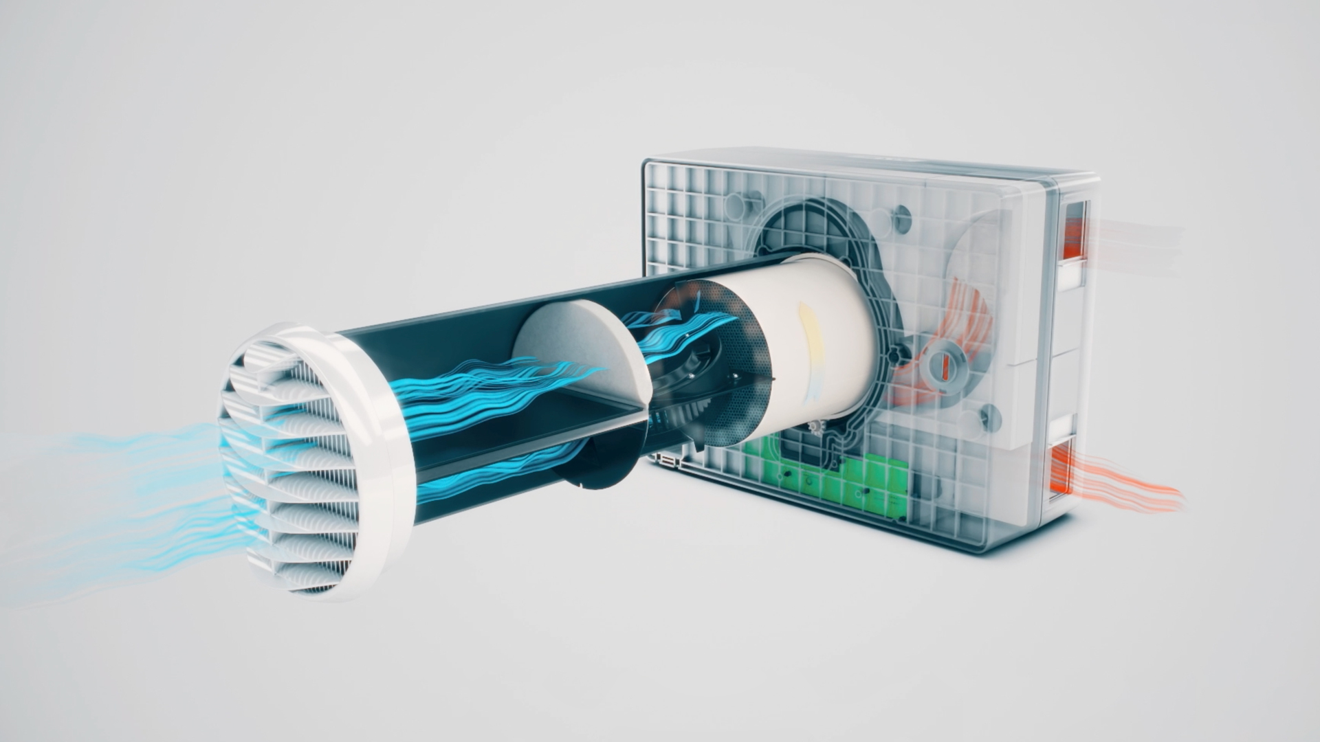 The ultra-compact design of the miniaturised rotary heat exchanger (1) enables regenerative heat recovery in a compact casing for the first time. Two pressure-stable ventilators (2) ensure a balance (3) of supply and exhaust air without any drop in performance, even when there is high wind pressure on the facade. It is also possible to operate the system using supply or exhaust air only, by switching off the relevant ventilator – for intelligent bathroom control, for example. And temporarily deactivating the heat recovery function means that passive cooling is even possible in summer.
